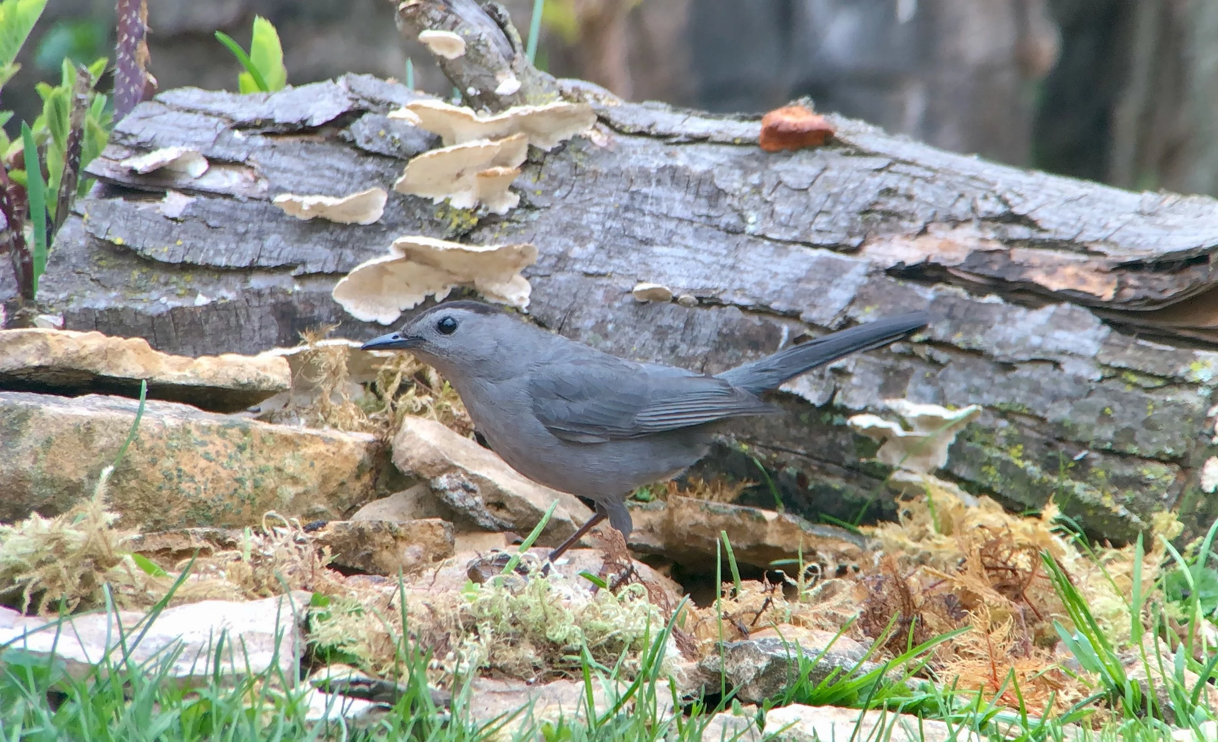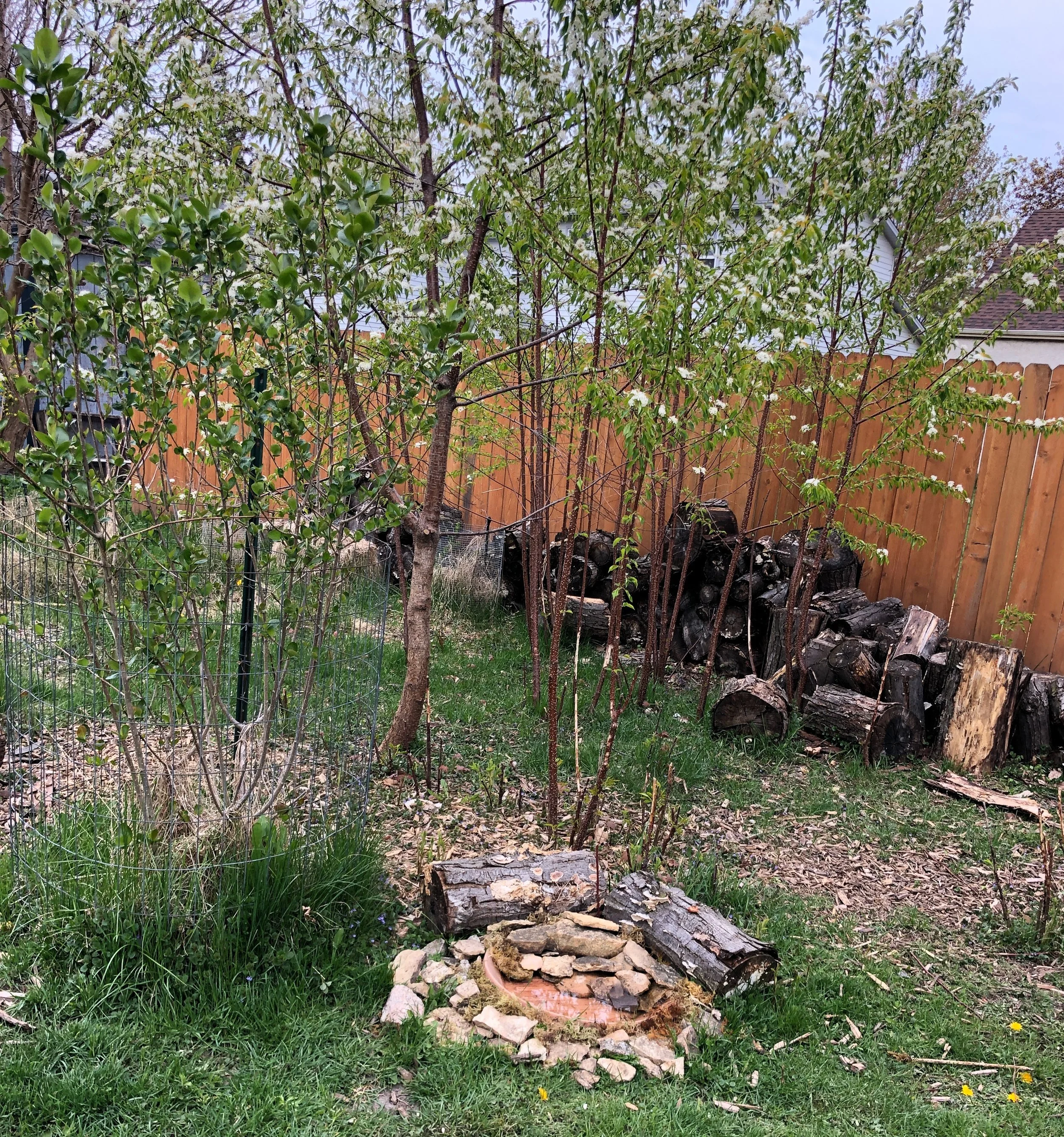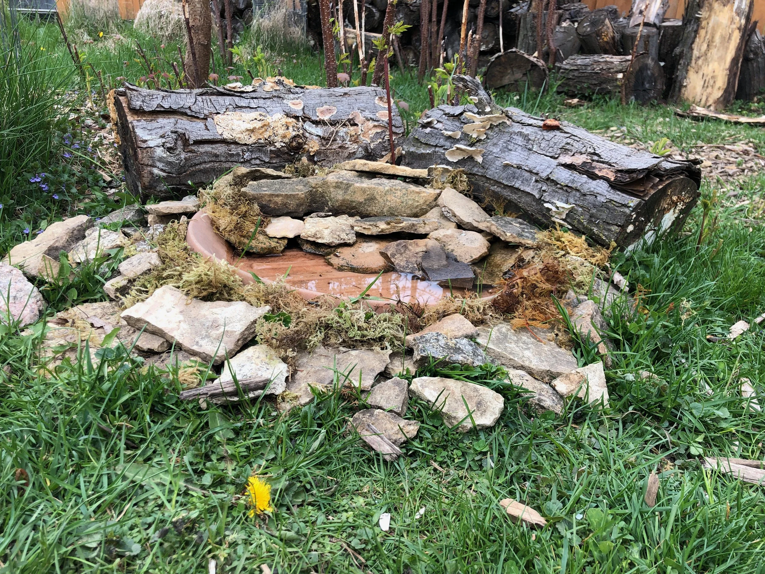 I ended up moving in with someone at the start of the pandemic who had a good base layer of a yard for birds—lots of great plants and trees for birds as well as a pile of logs leftover from a tree that came down a few years earlier. They had been using a plastic dish to go under a planter for water. I took it, placed on the edge of some choke berry trees, surrounded it it and filled it with rocks and placed a few old logs around it.