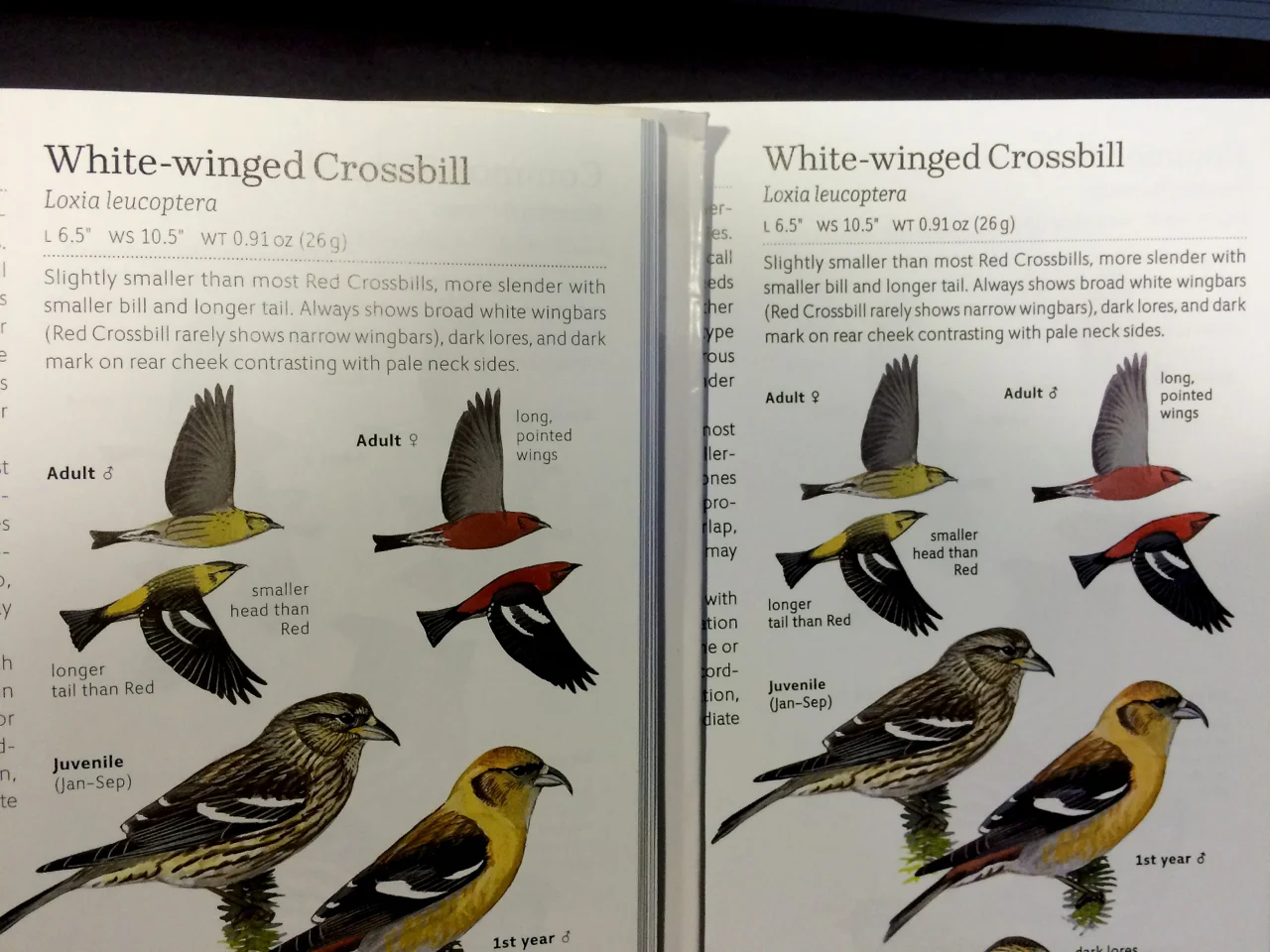 Typos like the white-winged crossbill sex mixup have been addressed as well. First printing on the left, second printing on the right.