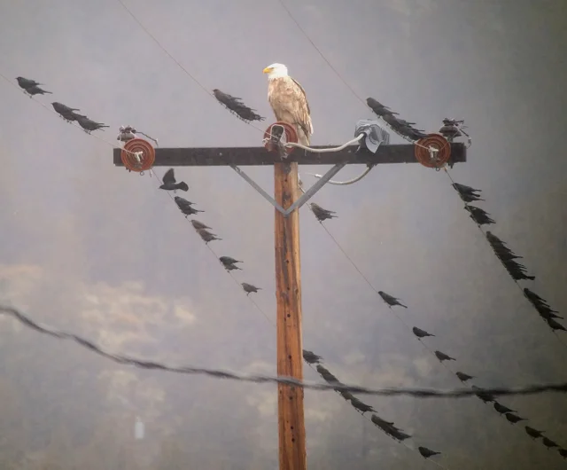 Dilute plumaged or leucistic adult bald eagle surrounded by Brewer's blackbirds.