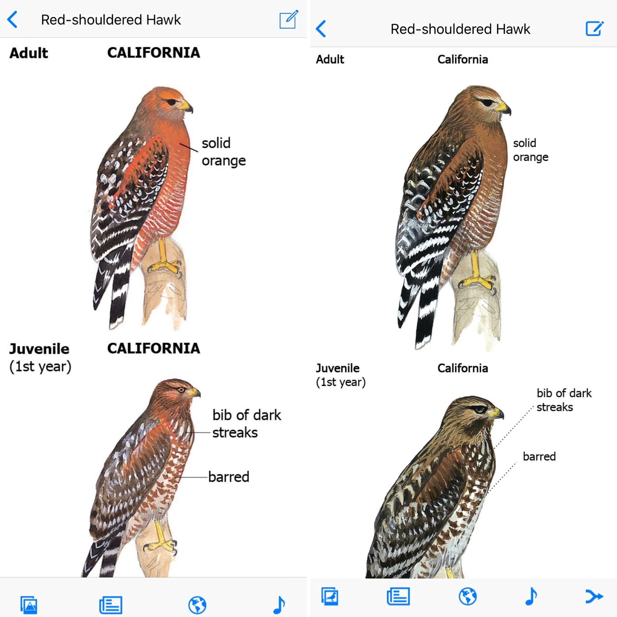 Then I went to the red-shouldered hawk page and realized…the app company digitized the wrong printing…the one that had plates that were too dark. The one where the publisher issued a recall. How did this happen? Did no one pay attention to file names? Also as someone who is kind of anal about planning…how did Sibley, the editors, agents or even early reviewers not double check this?????