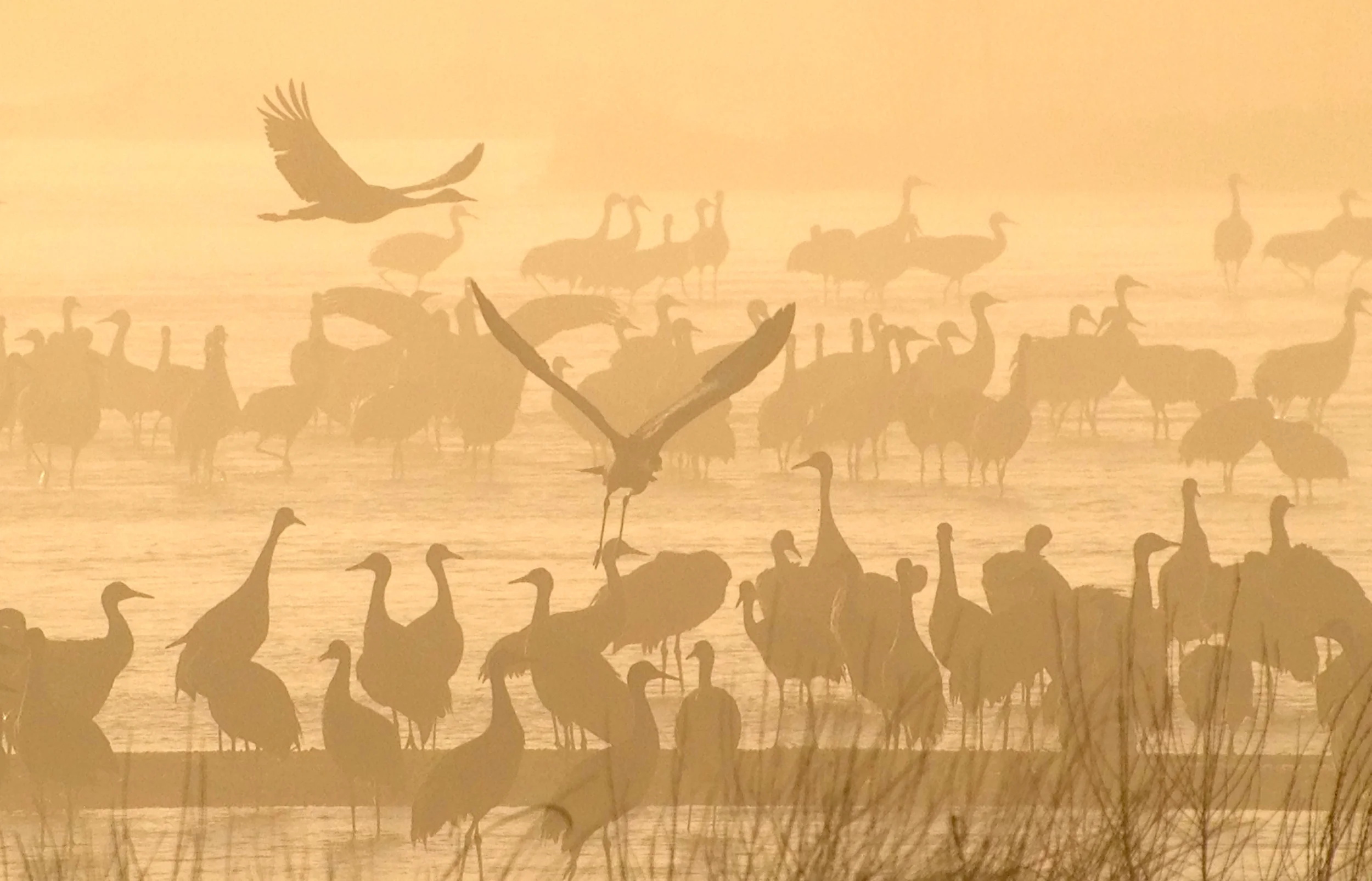 But I have had occasion to see birders cheer odd things like actual life and death instances. I was co-leading a trip to Kearney, Nebraska to see a million snow geese and about 40,000 sandhill cranes pausing in their northward migration to their arctic breeding grounds. The highlights are going to the roost at dawn and at dusk to see the massive congregations of birds. When you aren't in the crane blinds you drive around to watch the birds forage for waste corn in the surrounding farm fields. Our group was watching a large flock when the birds suddenly spooked and took to the sky forming a huge gray crane tornado.